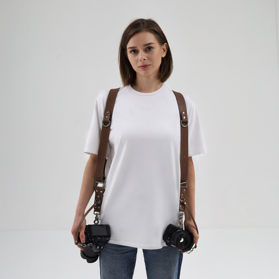 Our brown dual camera harness are designed to provide security and comfort and enhance your creative impulse. You can comfortably carry your two cameras with you and take incredible shots with ease.